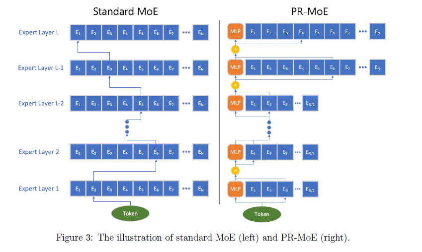 we develop and implement a exible multi-expert and multi-data parallelism design on top of DeepSpeed-MoE, that allows for training different parts of the model with different expert and data parallelism degree. For instance, a PR-MoE model running on 128 GPUs, with 32, 64, and 128 experts at different MoE layers, can be trained with 128-way data parallelism for the non-expert parallelism, and f32, 64, 128g expert parallelism plus f4, 2, 1g data parallelism for MoE parameters.