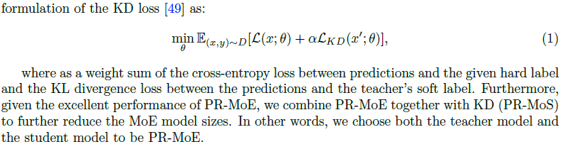 We find that while KD loss improves validation accuracy initially, it begins to hurt accuracy towards the end of training. the student PR-MoE may not have enough capacity to minimize both the training loss and the knowledge distillation loss, and might end up minimizing one loss (KD loss) at the expense of the other (cross entropy loss), especially towards the end of training. The aforementioned hypothesis suggests that we might want to either gradually decay the impact from KD or stop KD early in the training process and perform optimization only against the standard language modeling loss for the rest of the training