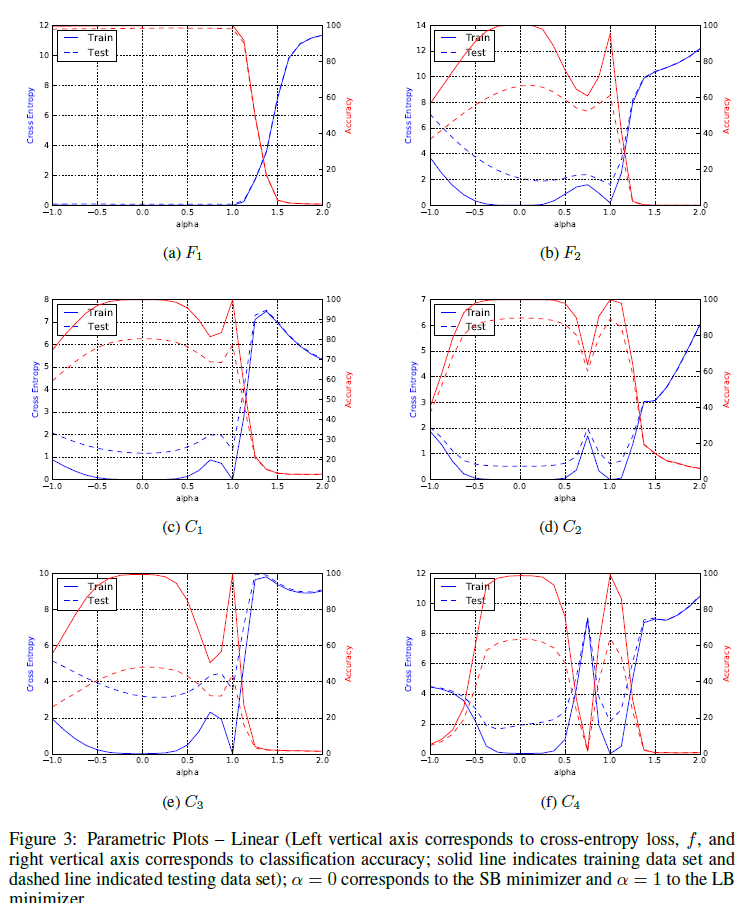 We conclude this section by noting that the sharp minimizers identified in our experiments do not resemble a cone(不是圆锥形), i.e., the function does not increase rapidly along all (or even most) directions. By sampling the loss function in a neighborhood of LB solutions, we observe that it rises steeply only along a small dimensional subspace (e.g. 5% of the whole space); on most other directions, the function is relatively