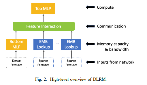 The inputs to the recommendation model include both dense and sparse features. The dense or the continuous features are processed with a bottom multilayer perceptron (MLP) while the sparse or the categorical features are processed using embeddings. The second-order interactions of different features are computed explicitly. Finally, the results are processed with a top MLP and fed into a sigmoid function in order to provide a probability of a click.