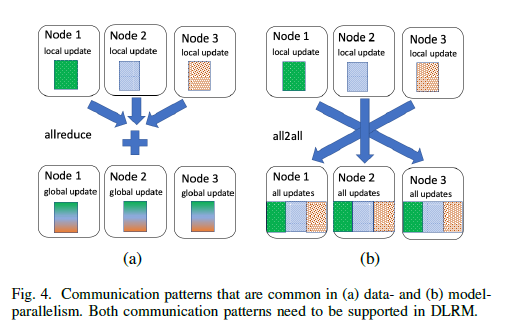 Aside from the standard send/recv communication primitives, the data- and model-parallelism used in distributed training give rise to two types of communication patterns: (i) allreduce operation that is often used to aggregate local parameter updates in the backward pass and (ii) alltoall operation that can be used to exchange the activations and error gradients across multiple nodes with different model weights.
