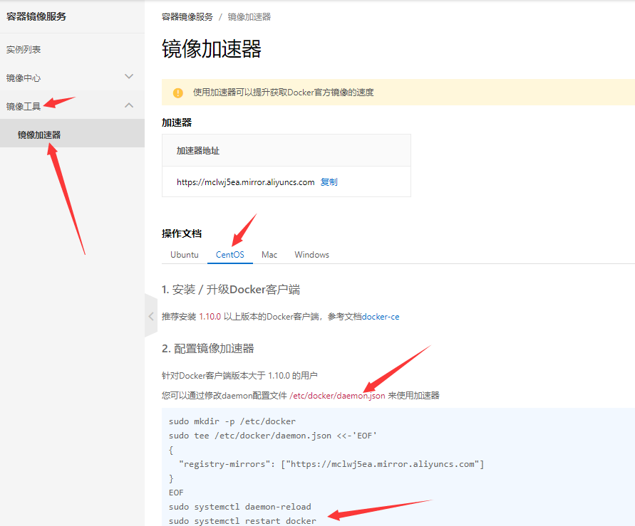 登录你的阿里云控制台查看相关操作 https://cr.console.aliyun.com/cn-beijing/instances/mirrors 界面如下: