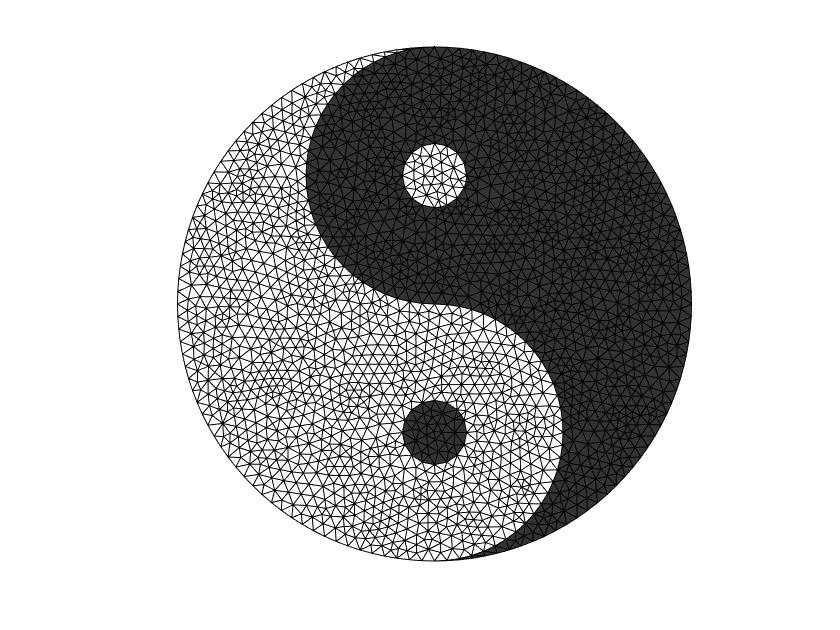 clc,clear; close all; g1=[1 1 1 1; 2 0 -2 0;0 -2 0 2; 0 2 0 -2; 2 0 -2 0; 1 2 2 1; 0 0 0 0;0 0 0 0;0 0 0 0;2 2 2 2]; % 大○ g2=[1 1 1 1;0 1 0 -1;1 0 -1 0;-2 -1 2 1;-1 0 1 0; 2 2 1 1;1 1 2 2;0 0 0 0;-1 -1 1 1;1 1 1 1]; % 分界线 g3=[1 1 1 1;0.5 0 -0.5 0;0 -0.5 0 0.5;1 1.25 1 0.75;1.25 1 0.75 1; 3 3 3 3;1 1 1 1;0 0 0 0;1 1 1 1;0.25 0.25 0.25 0.25]; % 上○ g4=[1 1 1 1;0.5 0 -0.5 0;0 -0.5 0 0.5;-1 -0.75 -1 -1.25;-0.75 -1 -1.25 -1; 4 4 4 4; 2 2 2 2; 0 0 0 0;-1 -1 -1 -1;0.25 0.25 0.25 0.25]; % 下○ g=[g1 g2 g3 g4]; [p,e,t] = initmesh(g,'hmax',0.1); figure pdemesh(p,e,t); %% Identify nodes and elem in different regions. [elem1,elem2,elem3,elem4]=Idtaiji_4R(p,t); %% 染色 node=p'; h1 = trisurf(elem1,node(:,1),node(:,2),zeros(size(node,1),1)); set(h1,'facecolor',[0.2 0.2 0.2],'edgecolor','k'); view(2); axis equal; axis tight; axis off; hold on % h2 = trisurf(elem2,node(:,1),node(:,2),zeros(size(node,1),1)); set(h2,'facecolor','w','edgecolor','k'); view(2); axis equal; axis tight; axis off; hold on % h3 = trisurf(elem3,node(:,1),node(:,2),zeros(size(node,1),1)); set(h3,'facecolor','w','edgecolor','k'); view(2); axis equal; axis tight; axis off; hold on % h4 = trisurf(elem4,node(:,1),node(:,2),zeros(size(node,1),1)); set(h4,'facecolor',[0.2 0.2 0.2],'edgecolor','k'); view(2); axis equal; axis tight; axis off;