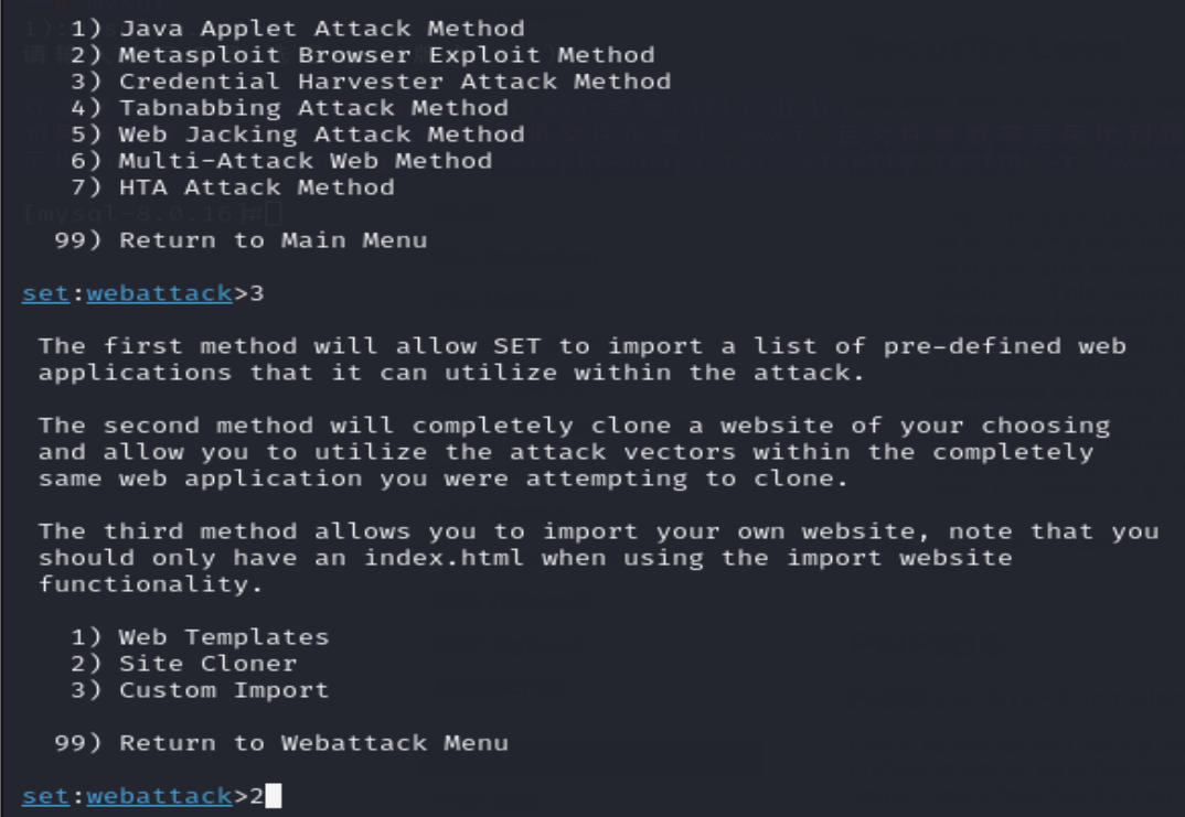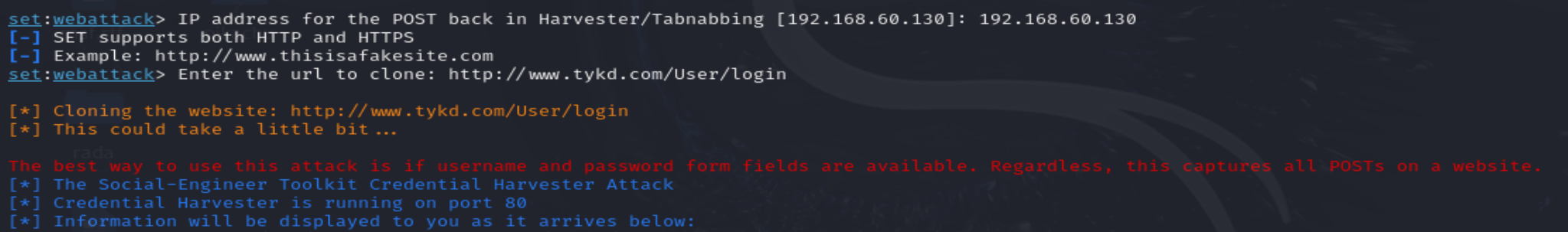 接下来设置攻击机的IP地址和要克隆的网站URL