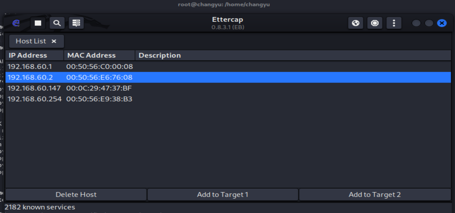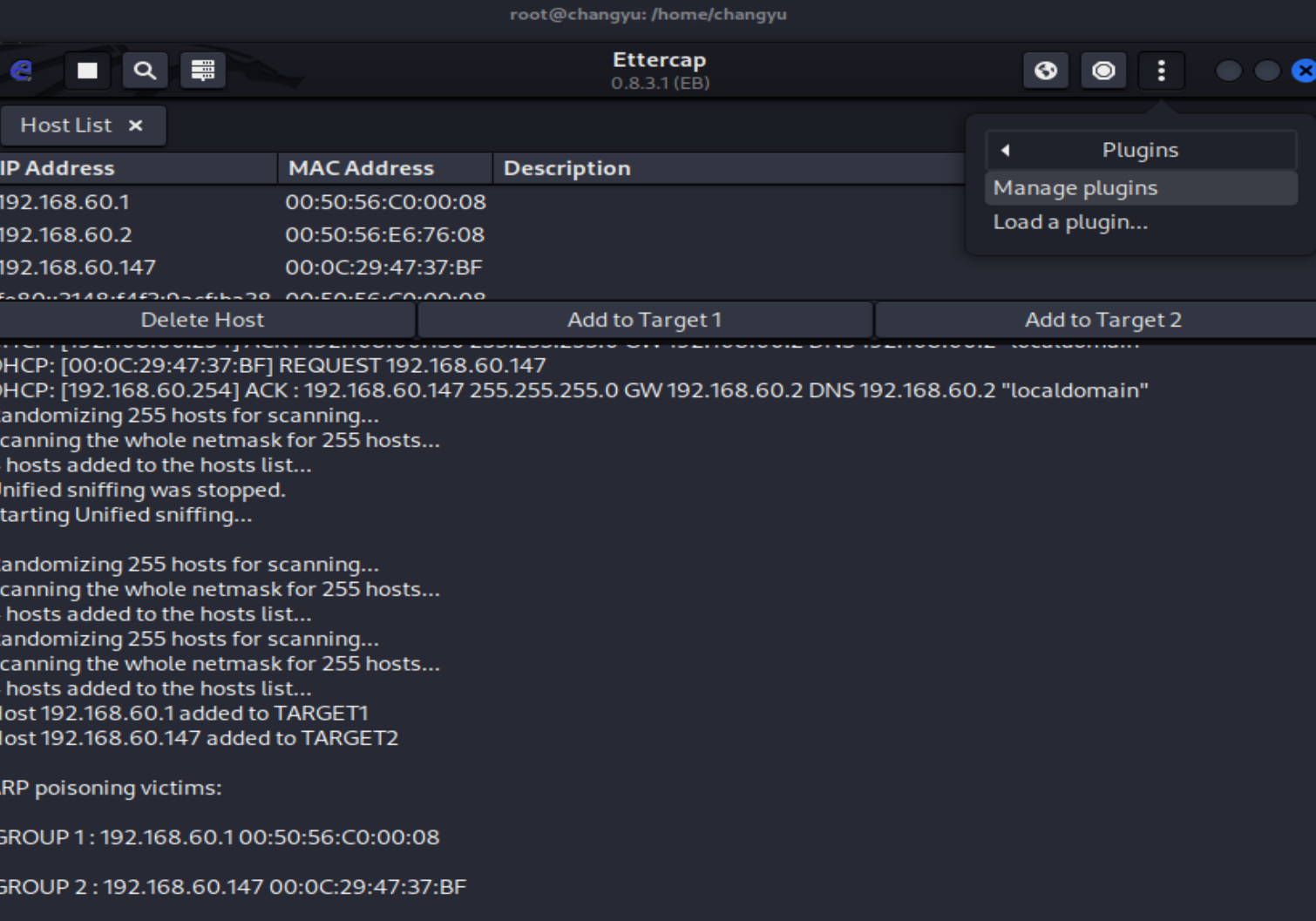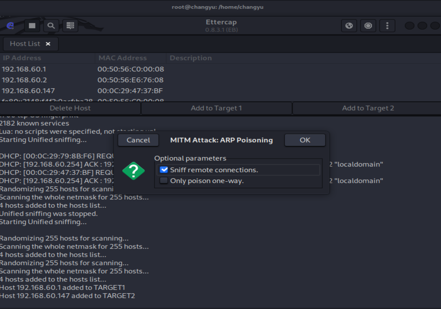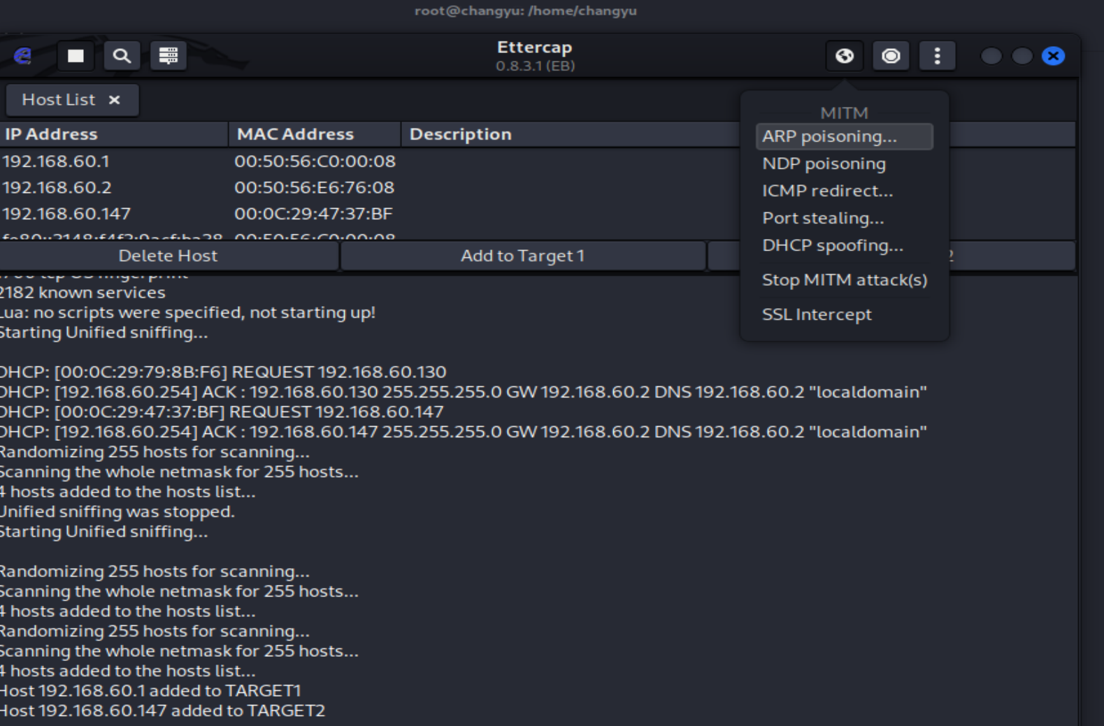 - 问题1解决方案:ettercap中设置target时应该注意192.168.60.1不一定是网关,需要根据具体情况进行调整