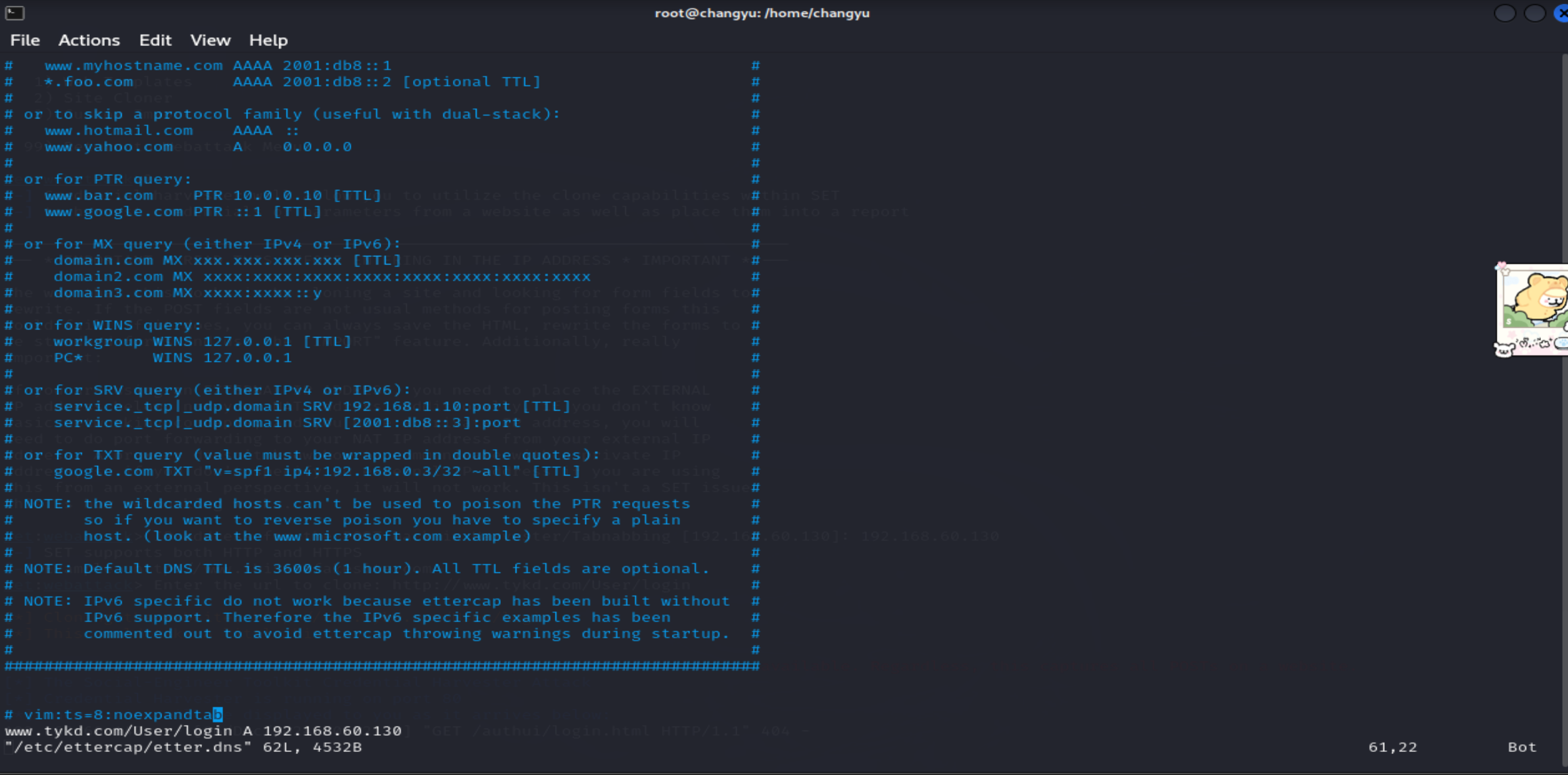 (3)结合应用两种技术,用DNS spoof引导特定访问到冒名网站。