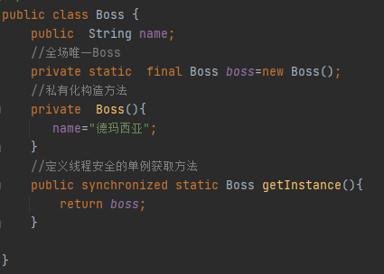 总结:单例模式主要用于不同线程之间的并发访问或者通信,也可以达到节约资源的目的,其有两种模式,饿汉和饱汉模式。饿汉模式即在类加载时就创建单例,如图上所示,而懒汉模式则在第一次需要使用的时候才开始创建,但是会存在多线程同时访问,生成两个或者多个单例的问题,常用的线程池就是典型的单例。