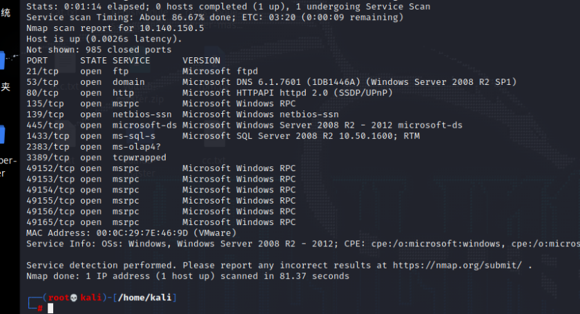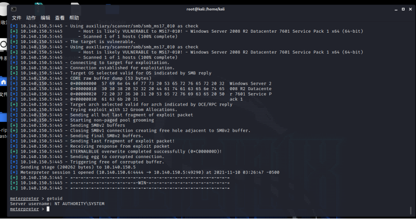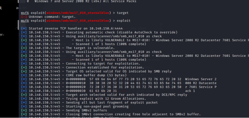 探测到靶机开放445端口,而永恒之蓝利用的就是445端口的smb服务,操作系统溢出漏洞。