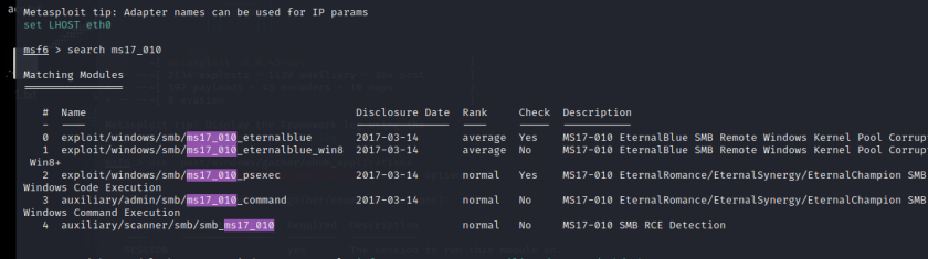 目前在Metasploit上集成的攻击载荷是ms17_010_psexec和ms17_010_eternalblue