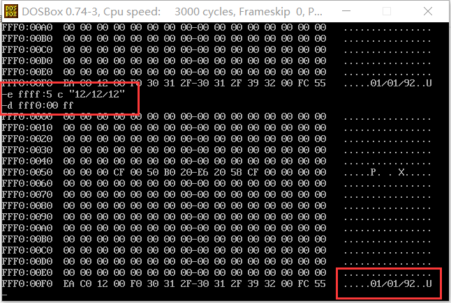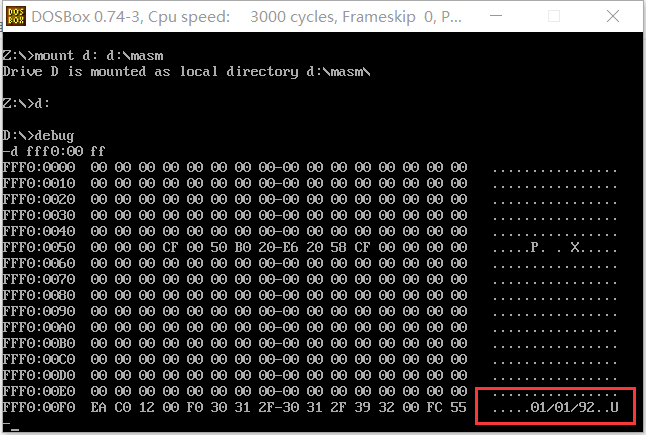 PC机主板上的ROM中有一个生产时期,在内存FFF00H ~ FFFFFH的某几个单元中,请找到这个生产时