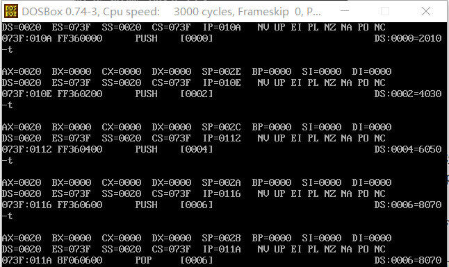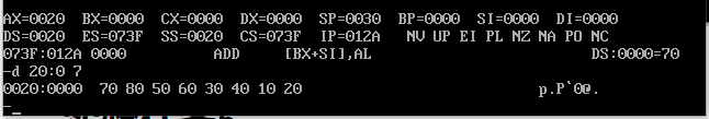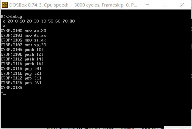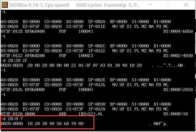 当执行pop指令时,低地址依次出栈。 - pop [0] 指令执行结束后,使用d命令 d 20:0 7 查看此时数据空间内的数据是否有变化。
