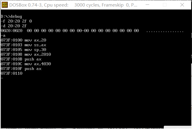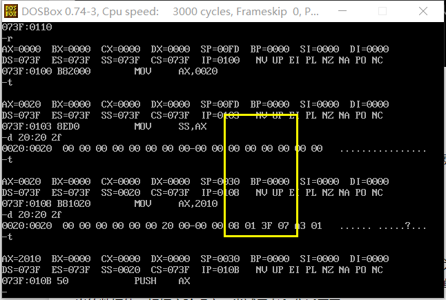 过f命令将初始栈空间全部填充为0。观察单步调试时,栈空间00220H ~ 0022fH内存单元值的变化,特