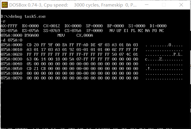 使用masm、link,汇编、链接,得到可执行文件task5.exe。运行程序。结合程序运行结果,理解程序