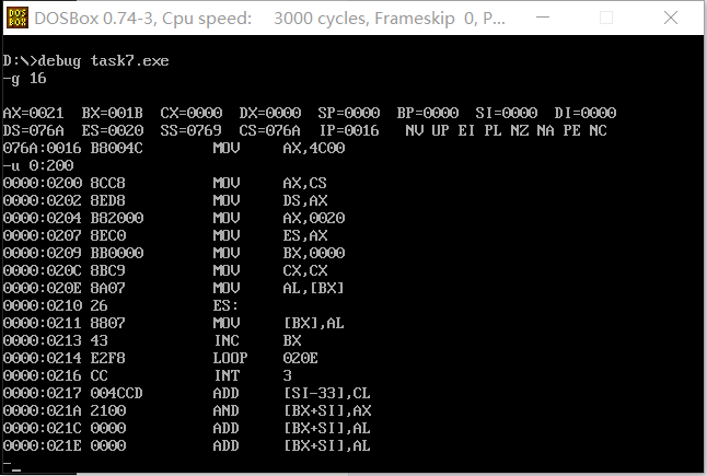 对0:200h开始的内存单元反汇编,确认是否把task7.asm中line3-line12的代码复制到了目标内存空间。![]()