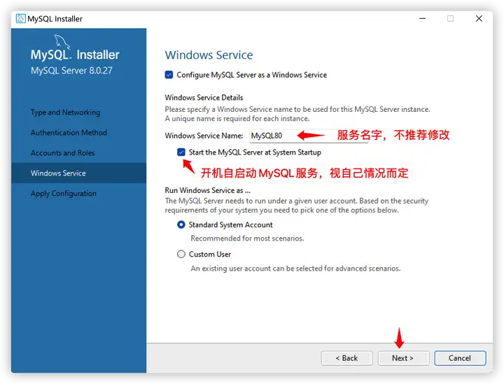 - 按照自己的需求选择即可。不推荐修改服务的名称。