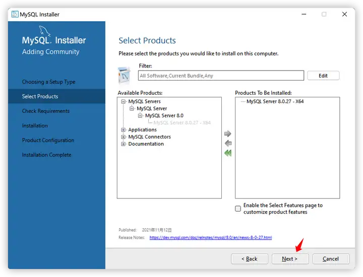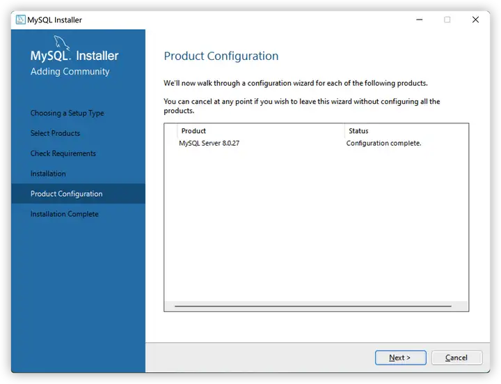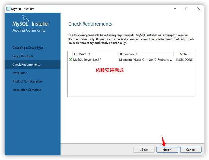 - 依赖安装完成,点击Next进行MySQL的安装