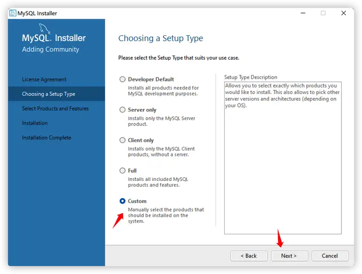 - 选择Custom,自定义安装,Next