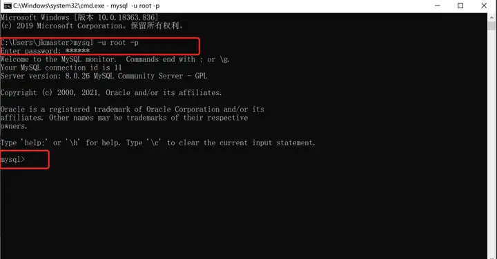 mysql -u root -p回车输出密码(密码是加密不可见状态),然后回车出现mysql界面就证明安装成功了