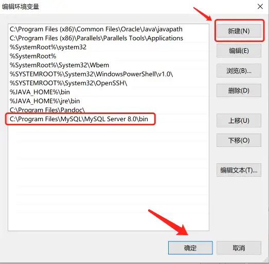 17.点击新建,然后添加C:\Program Files\MySQL\MySQL Server 8.0\bin,点击确定