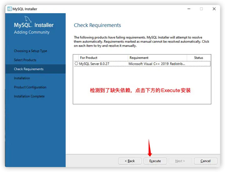 - 如果检测到了依赖的缺失,点击下方的Execute进行依赖的下载和安装,不要点击Next。