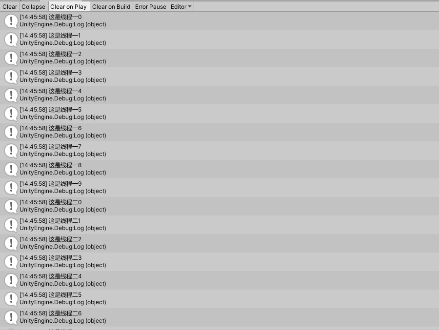 using System.Collections; using System.Collections.Generic; using UnityEngine; using System.Threading; public class test { private static object lock_obj = new object(); string str; string path; public test(string str, string path) { this.str = str; this.path = path; } public void Pri() { lock (lock_obj) { for (int i = 0; i < 10; i++) { Debug.Log(path + i); } } } } public class ApplicationStart : MonoBehaviour { // Start is called before the first frame update void Start() { string str1 = "ssss"; string str2 = "ssss"; test t1 = new test(str1, "这是线程一"); Thread thread1 = new Thread(new ThreadStart(t1.Pri)); thread1.Start(); test t2 = new test(str2, "这是线程二"); Thread thread2 = new Thread(new ThreadStart(t2.Pri)); thread2.Start(); } }