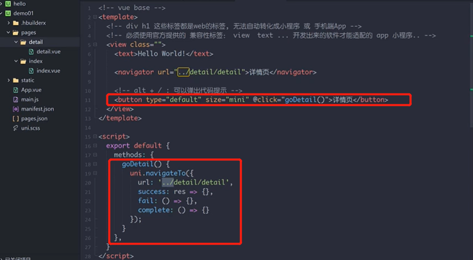 <button type="default" size="mini" @click="goDetail()">按钮跳转详情页</button>