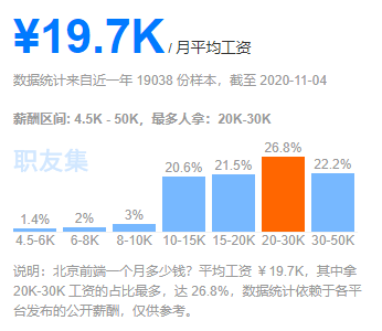 北京前端程序员平均工资:19700元/月(数据截止到2020年11月4日,取自19038份样本)