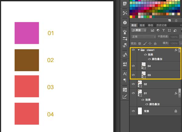 好!!!现在我要变形啦,,哦 不,我要引用了,注意!!注意!!!把第三第四个矩形引用(放入)一下class1类(文件夹)。则可以看到03、04都变了颜色。