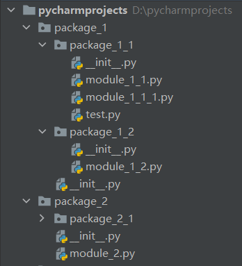 项目根目录下有两个包,package_1和package_2;package_1下有两个包package_1_1和package_1_2;package_2下有一个包package_2_1。