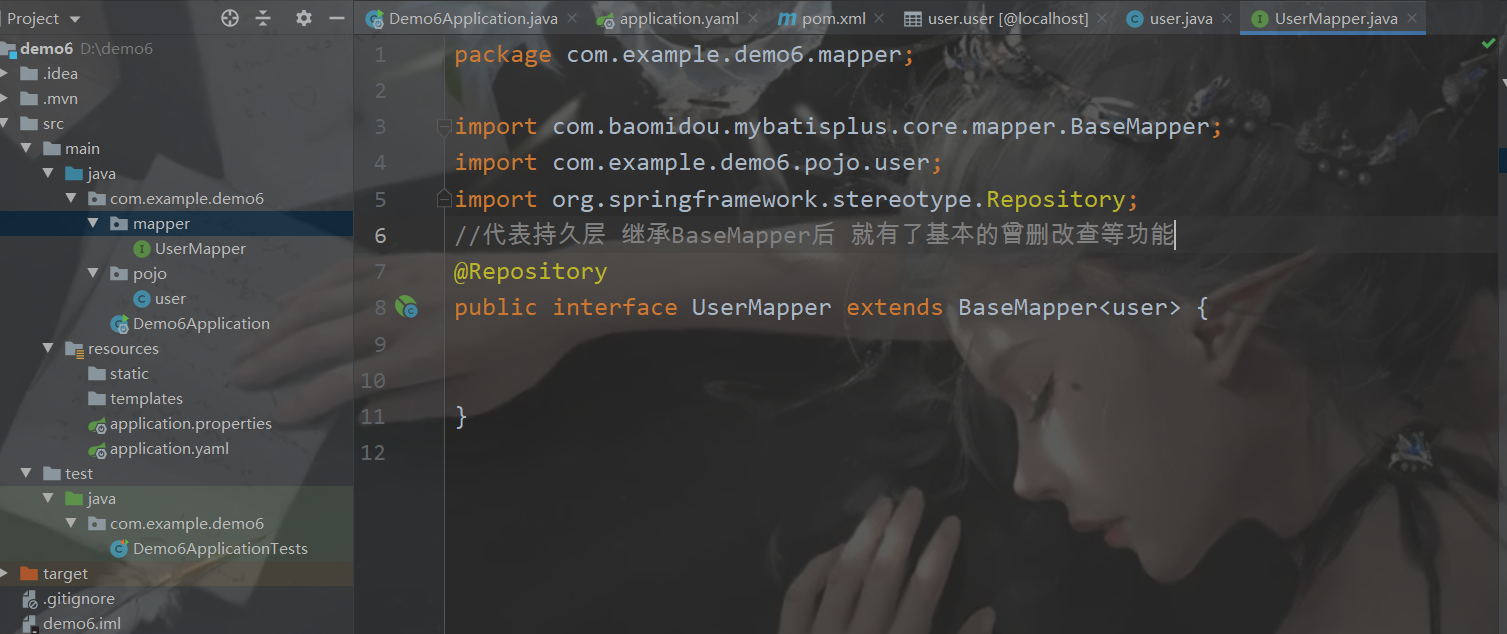 1 package com.example.demo6.mapper; 2 3 import com.baomidou.mybatisplus.core.mapper.BaseMapper; 4 import com.example.demo6.pojo.user; 5 import org.springframework.stereotype.Repository; 6 //代表持久层 继承BaseMapper后 就有了基本的曾删改查等功能 7 @Repository 8 public interface UserMapper extends BaseMapper<user> { 9 10 11 }