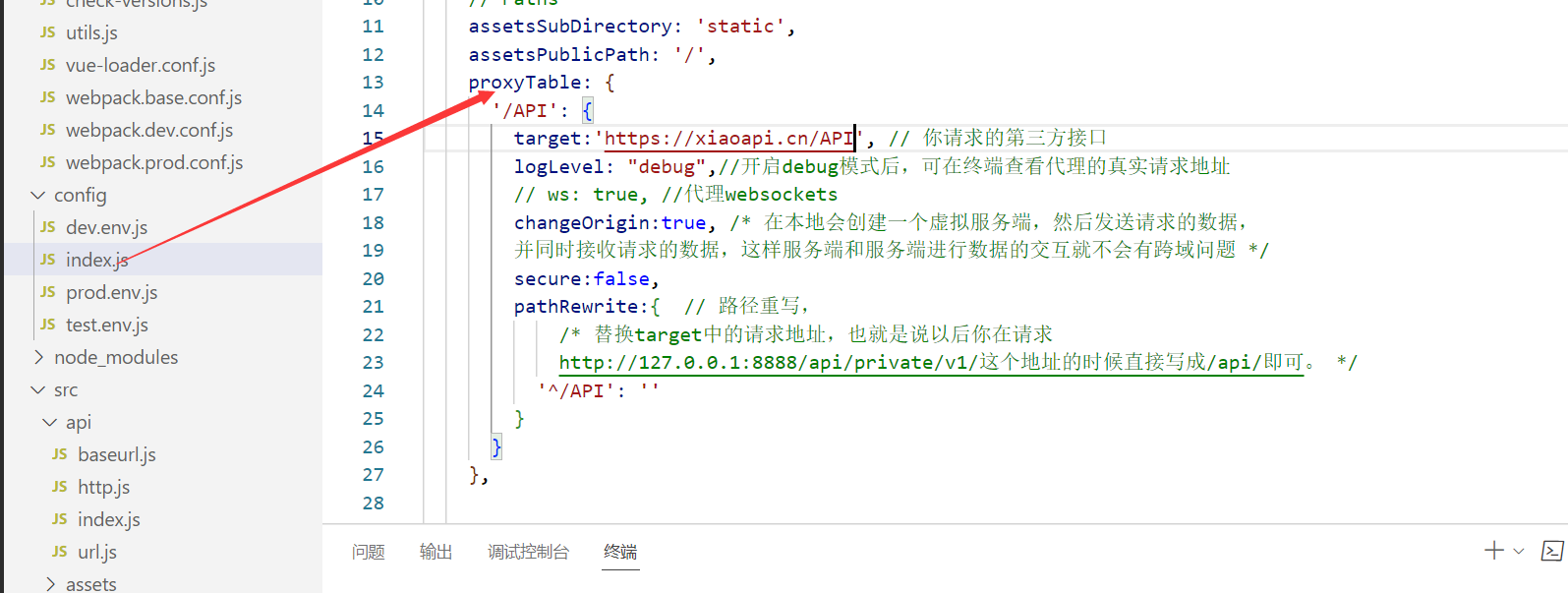 1 '/API': { 2 target:'https://xiaoapi.cn/API', // 你请求的第三方接口 3 logLevel: "debug",//开启debug模式后,可在终端查看代理的真实请求地址 4 // ws: true, //代理websockets 5 changeOrigin:true, /* 在本地会创建一个虚拟服务端,然后发送请求的数据, 6 并同时接收请求的数据,这样服务端和服务端进行数据的交互就不会有跨域问题 */ 7 secure:false, 8 pathRewrite:{ // 路径重写, 9 /* 替换target中的请求地址,也就是说以后你在请求 10 http://127.0.0.1:8888/api/private/v1/这个地址的时候直接写成/api/即可。 */ 11 '^/API': '' 12 }