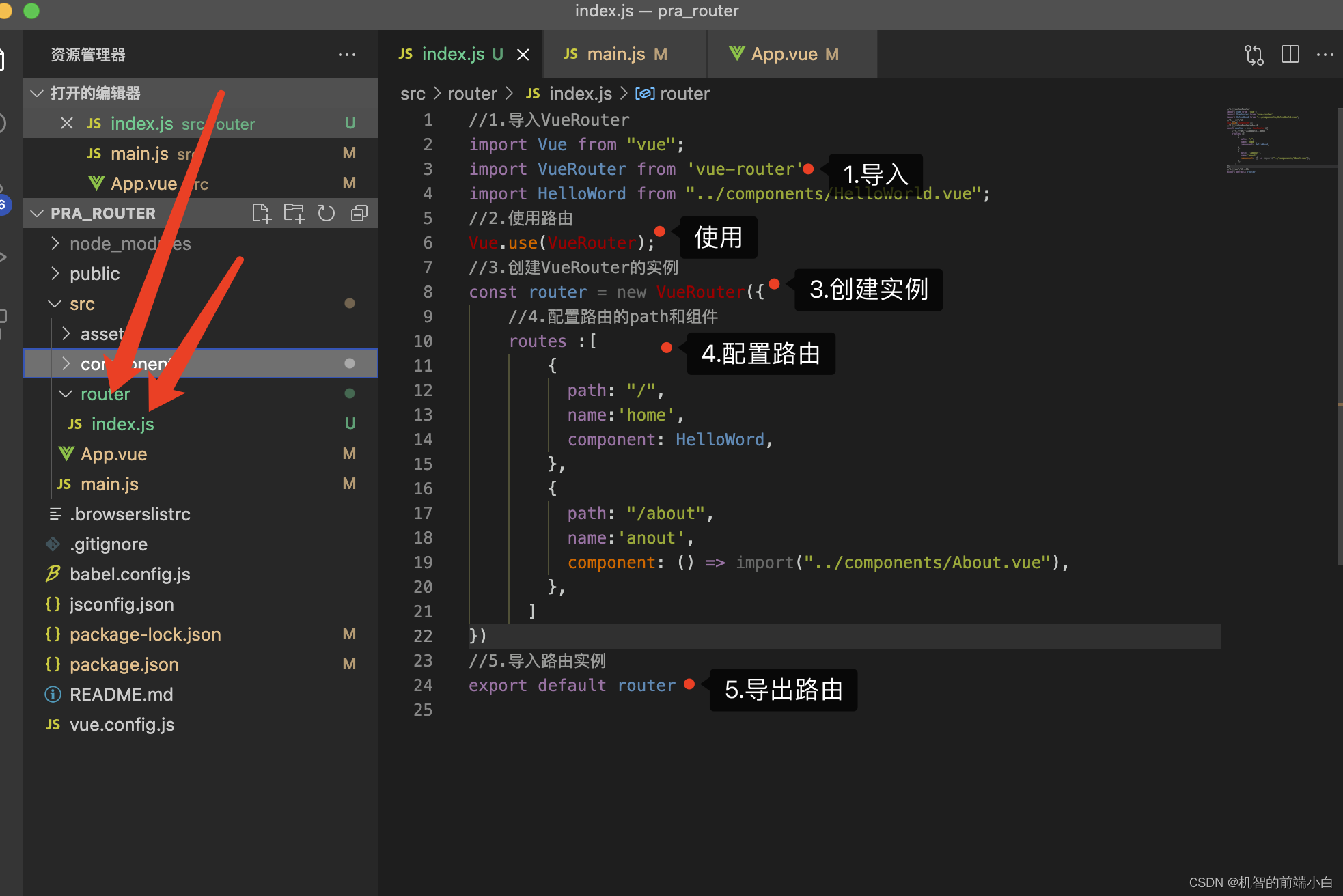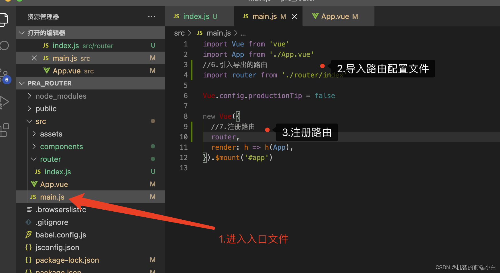 import Vue from 'vue' import App from './App.vue' //6.引入导出的路由 import router from './router/index' Vue.config.productionTip = false new Vue({ //7.注册路由 router, render: h => h(App), }).$mount('#app')