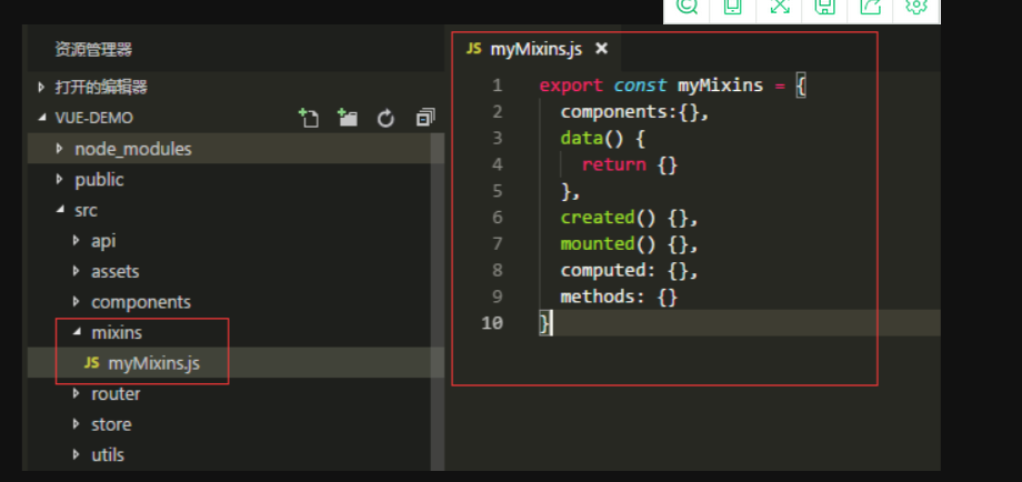 在src目录下创建一个mixins文件夹,文件夹下新建一个myMixins.js文件。前面我们说了mixins是一个js对象,所以应该以对象的形式来定义myMixins,在对象中我们可以和vue组件一样来定义我们的data、components、methods 、created、computed等属性,并通过export导出该对象