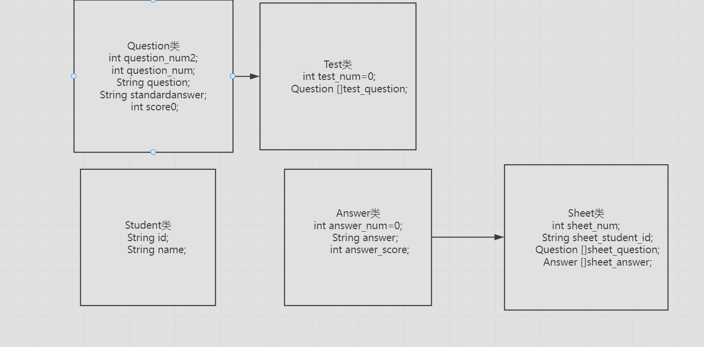 Question与Test类为结合关系,Answer类与Sheet类也为结合关系,主要是对Test类和Sheet类进行操作