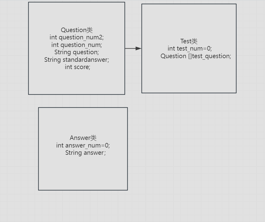 解决方法:并使用好类之间的三个主要关系——关联、聚合、组合。如:Question类是Test类的一部分即聚合关系。