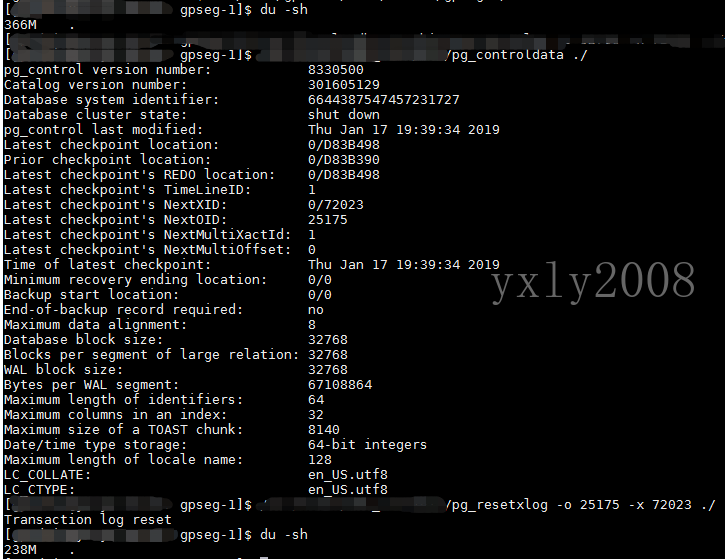 在segment下,会有pg_xlog文件夹,这个文件夹里存储的是wal日志信息,记录事务信息,类似oracle的redo日志,数据在进入greenplum数据库前,都是先进入到该日志文件中,所以该文件非常重要,千万不能手工操作该目录下的文件,如果直接手工删除了该文件,数据库就无法启动。所以删除该文件要谨慎,可以使用该命令:pg_resetxlog 。只有在xlog占用了大量空间的情况下才考虑清理,否则不建议清理。操作步骤: