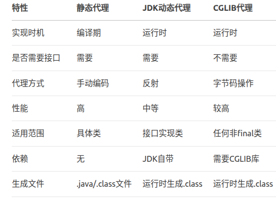 CGLIB 通过继承方式实现代理,很多知名的开源框架都使用到了 CGLIB,例如 Spring AOP 模块:如果目标对象实现了接口,则默认采用 JDK 动态代理,否则采用 CGLIB 动态代理。