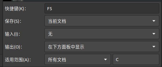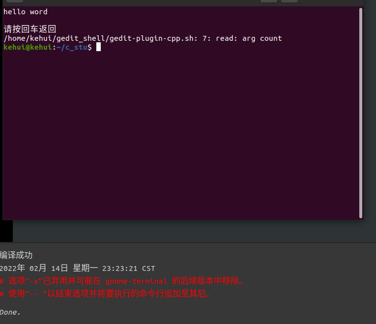 #!/bin/sh #文件目录名 fileDir=$GEDIT_CURRENT_DOCUMENT_DIR #文件名称 fileName=$GEDIT_CURRENT_DOCUMENT_NAME #文件名去后缀,也是运行编译生成的文件名 # %.* 表示字符串从右到左开始匹配.*,*代表任意字符串,匹配到第一个就停止,再将匹配到的字符从原字符串中删除,得到新的字符串 preFileName=${fileName%.*} #也可以这样子 # preFileName = "echo $GEDIT_CURRENT_DOCUMENT_NAME | cut -d. -f1" # | 表示将前面指令执行后的结果使用后面指令进行处理 # cut 表示对某字符串或者文件内容截取 # -d. 是cut命令的操作方法,表示指定某个位置,这里指定以.为目标位置切割 # -f1 是cut命令的操作方法,表示取每一行段落的第几个字符串,这里取第一个字符串(一行段落以空格为分割线,分割出多个字符串) #/home/kehui/gedit_shell/gedit-plugin-cpp.sh #执行gcc命令,对源码进行编译 gcc $fileDir/$fileName -o $preFileName -g -Wall #&& echo "编译成功" && date #运行编译生成的文件 #--working-directory=$fileDir #--hide-menubar if test $? -eq 0; then echo "编译成功" && date gnome-terminal --hide-menubar --working-directory=$fileDir -t "Console: $preFileName" -x bash -c "sh /home/kehui/gedit_shell/gedit-plugin-cpp.sh $fileDir/$preFileName;exec bash" fi - 上面代码中的sh /home/kehui/gedit_shell/gedit-plugin-cpp.sh里的gedit-plugin-cpp.sh文件需要自行创建,路径自己选,创建好用自己的文件路径,也可以用我的,就不用改路径了。gedit-plugin-cpp.sh内容如下
