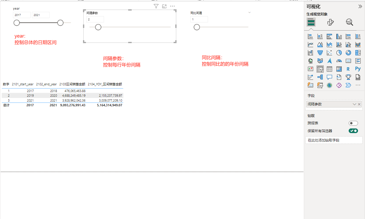 2103区间销售金额 = VAR start_year = [2101_start_year] VAR end_year = [2102_end_year] VAR year_value = CALCULATE ( [0001_销售金额_单位_D_], AND ( '01_calendar'[year] >= start_year, '01_calendar'[year] <= end_year ) ) RETURN year_value