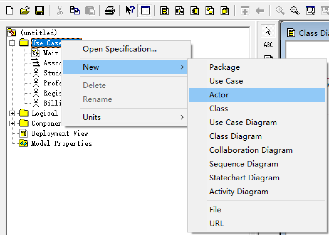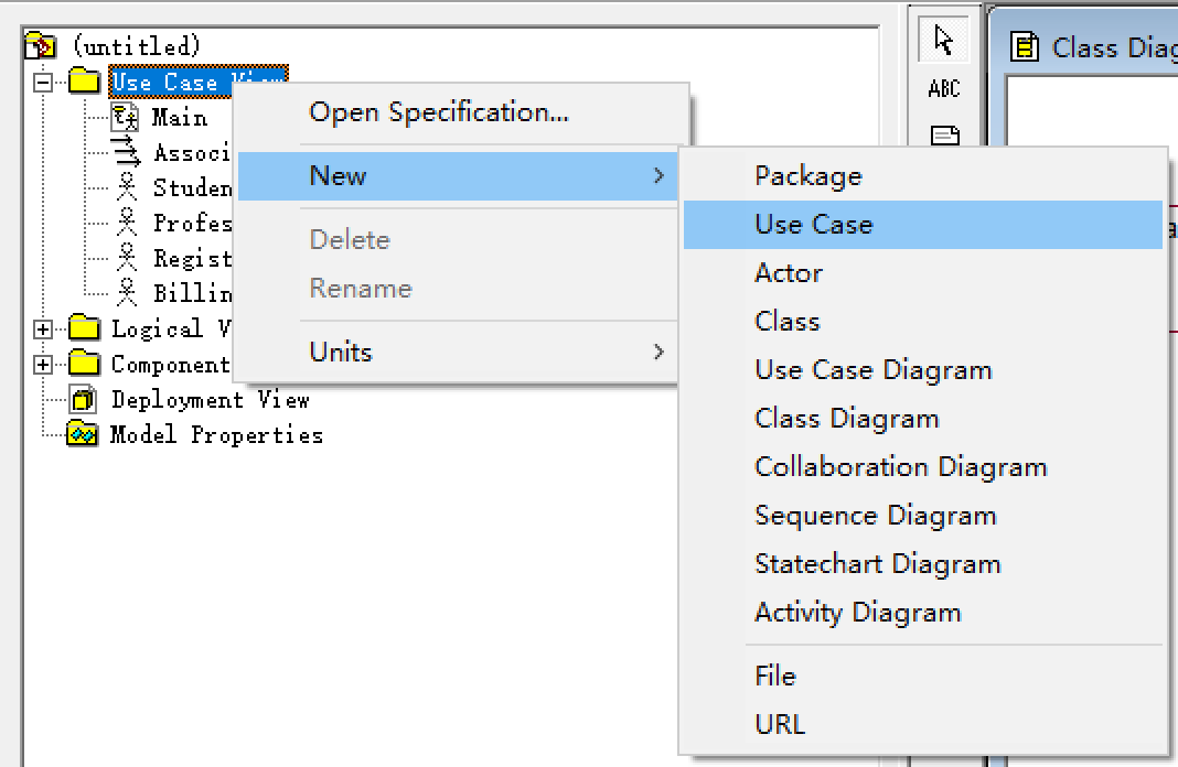 (1)在 Rational Rose 的 Browser 框中创建类(Class)