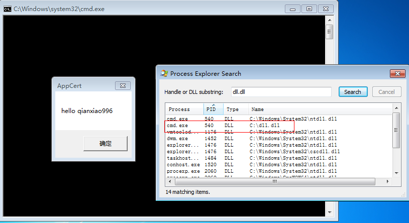 运行cmd.exe,就会发现cmd.exe已经加载指定dll,并弹框。