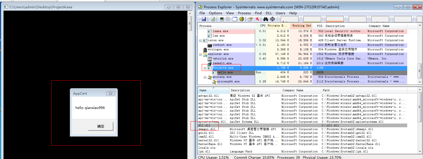 当运行测试exe的时候创建了进程,便调用了dll.dll文件,弹出hello qianxiao996窗口。