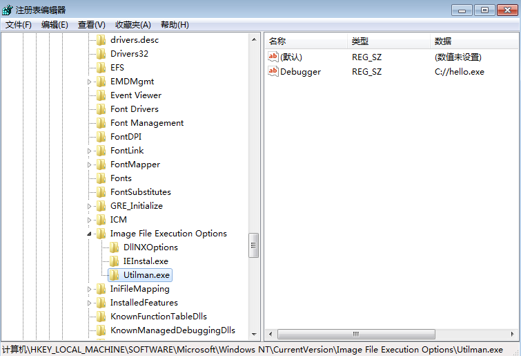 映像劫持,也被称为“IFEO”(Image File Execution Options)。当目标程序被映像劫持时,双击目标程序,系统会转而运行劫持程序,并不会运行目标程序。许多病毒会利用这一点来抑制杀毒软件的运行,并运行自己的程序。造成映像劫持的罪魁祸首就是参数“Debugger”,它是IFEO里第一个被处理的参数,系统如果发现某个程序文件在IFEO列表中,它就会首先来读取Debugger参数,如果该参数不为空,系统则会把Debugger参数里指定的程序文件名作为用户试图启动的程序执行请求来处理,而仅仅把用户试图启动的程序作为Debugger参数里指定的程序文件名的参数发送过去。参数“Debugger”本来是为了让程序员能够通过双击程序文件直接进入调试器里调试自己的程序。现在却成了病毒的攻击手段。简单操作就是修改注册表,在“HKEY_LOCAL_MACHINE\SOFTWARE\Microsoft\Windows NT\CurrentVersion\Image File Execution Option”中添加utilman.exe项,在此项中添加debugger键,键值为要启动的程序路径。