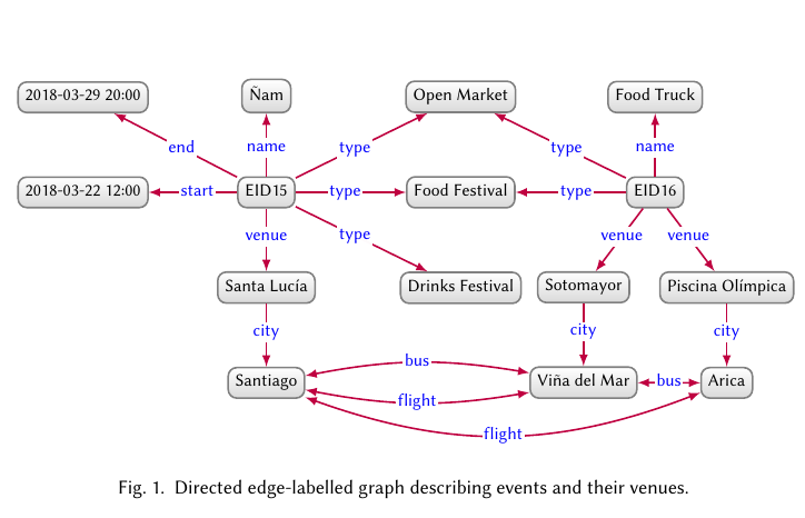 一个directed edge-labelled graph 是一个节点的集合加一个节点之间有向边的集合。在这种知识图谱中,节点用于展示实体而边用于展示实体间的(二元)关系。在这样的图中添加信息典型地涉及添加新的节点和边,展现未完成的信息仅需要省去一部分边。例如,图没有定义国庆节的起止日期。