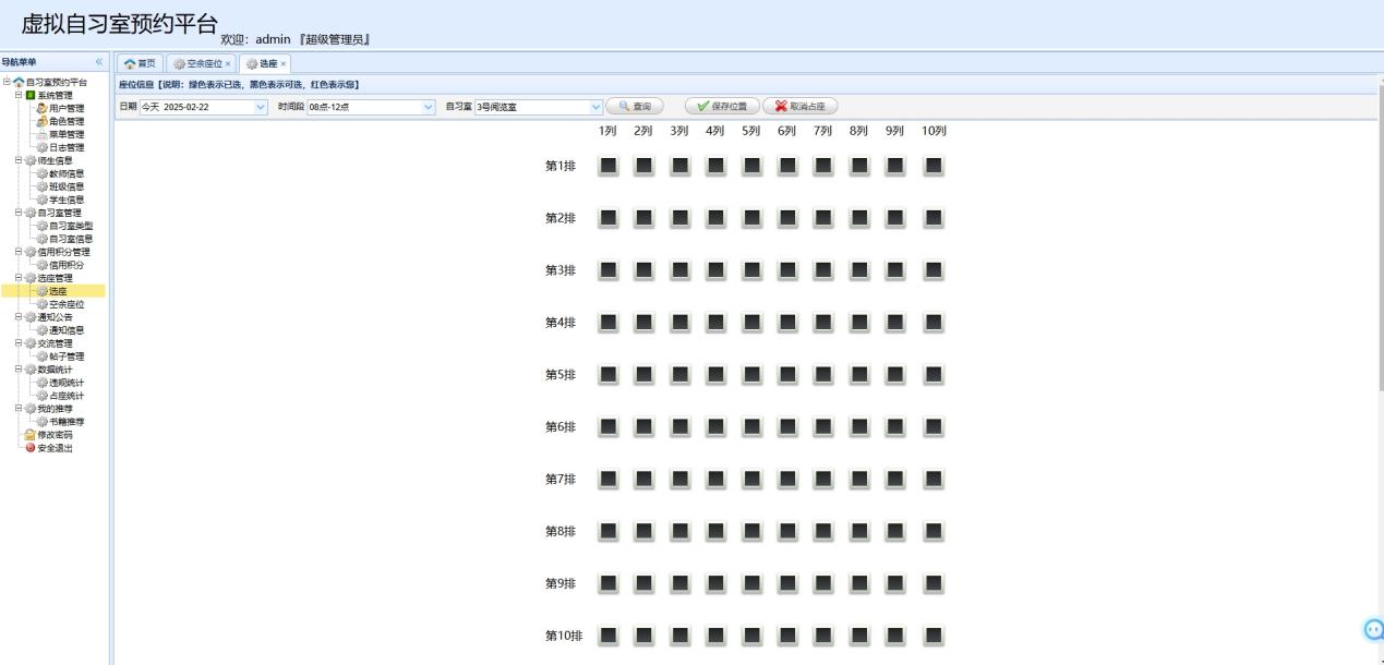 本系统主要实现的是用户对座位的一些写操作的功能。主要分为用户和管理员,用户是主要使用者。用户可以通过系统来进行选择座位预约、暂留座位等操作;管理员主要可以对座位信息进行添加修改删除等操作。管理员用户可以通过后台查看所有使用记录、管理座位、管理用户。