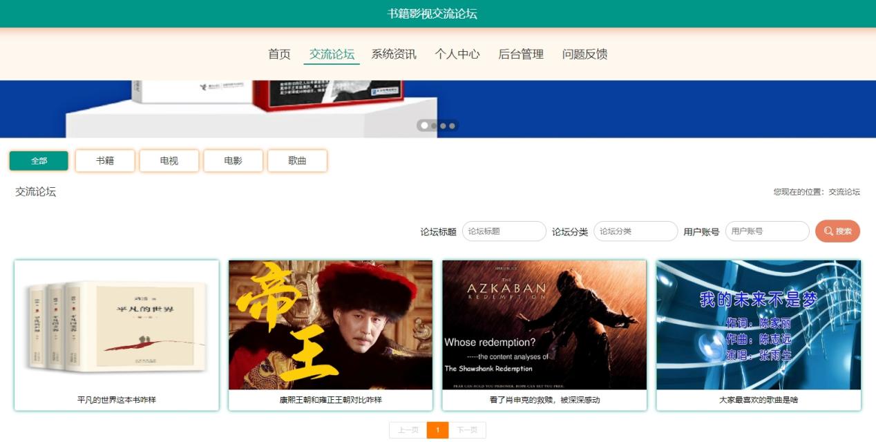 (2)论坛类别管理:对上映的书籍影视根据地域、类型等标准进行分类。并提供查询界面,方便用户可以在对感兴趣的一类书籍影视进行查询,观看,分享,评论。同时提供可对同一部影片进行多个类别的分类。