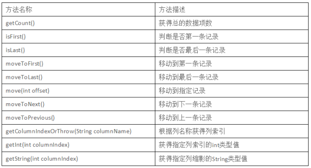 我们可以看到返回的类型都是Cursor,Cursor是一个游标接口,提供了遍历查询结果的方法,如移动指针方法move(),获得列值方法。Cursor游标常用方法如下: