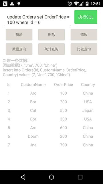 db.execSQL("insert into " + OrderDBHelper.TABLE_NAME + " (Id, CustomName, OrderPrice, Country) values (5, 'Arc', 600, 'China')");